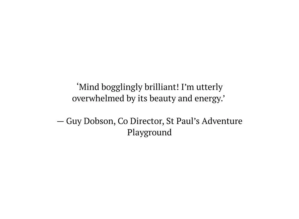 Photos and artworks were exhibited on poster boards, so that black & white collages beamed against the colourful structures of the loved playground. The work revealed is an inspirational guide to see what happens when ‘play is the place’ and ‘each one teaches one’. Both the book and exhibition attests to the crucial work of the Playground and all who support the vital need for everybody to muck around and make things up.